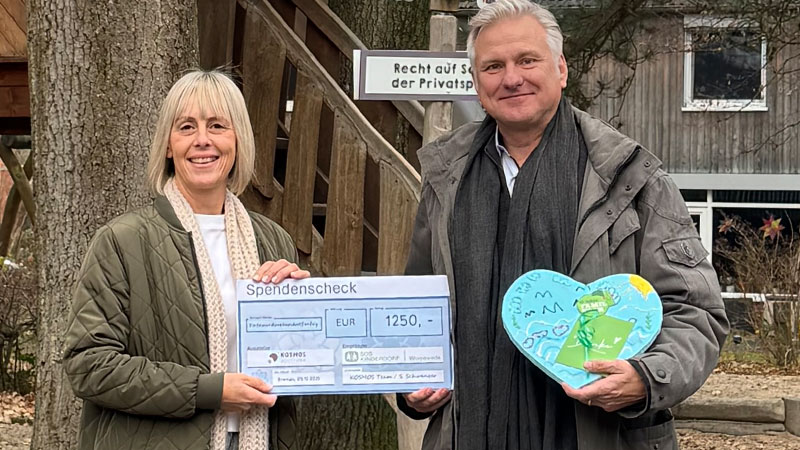 Dr. Stefan Schwenzer, Inhaber der KOSMOS Apotheke Bremen, überreichte einen Spendenscheck an die Vertreterin des SOS Kinderdorf Worpswede e. V.